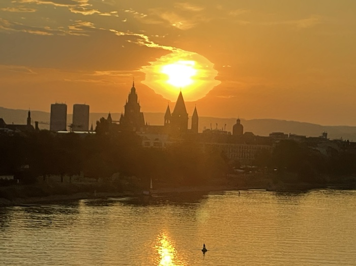 21.22 Uhr – Ein letztes Mal für heute über den Rhein mit der untergehenden Sonne hinter dem Taunuskamm.
