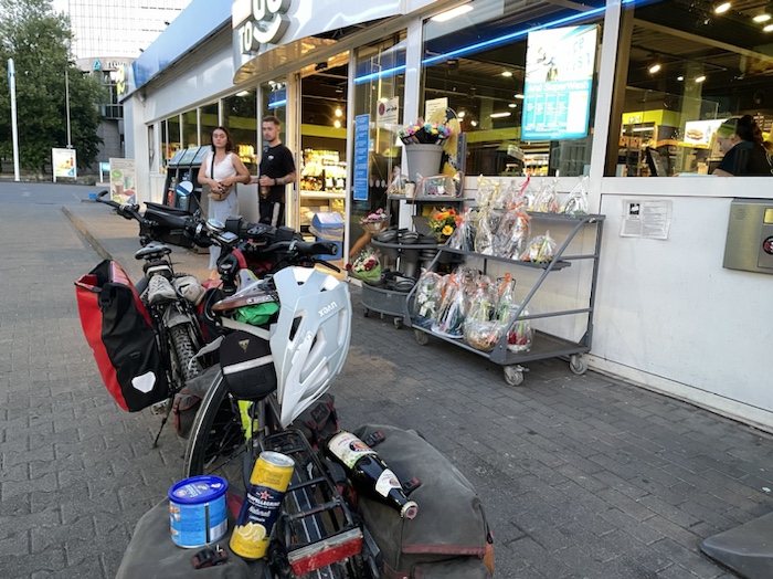 Vorher zur Tankstelle an der es einen Rewe-City-Supermarkt gibt, für Bier, Limo und Erdnüsse!