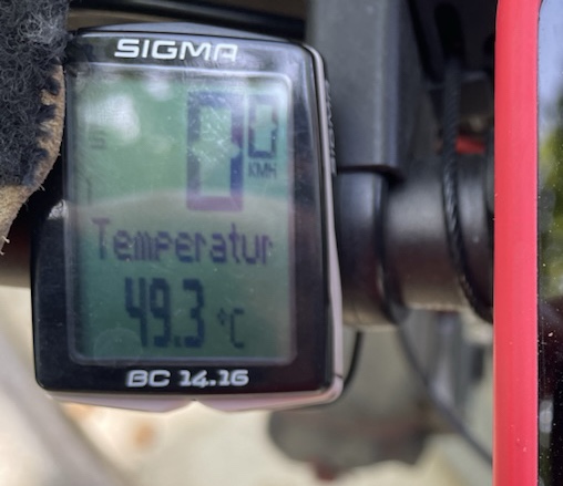18.31 Uhr – Der Weg zu den Toiletten war mit dem Rad nicht einfach. Meine Füße scheinen mir ziemlich geschwollen zu sein. Da sind ein paar Kilometer auf dem Rad sicher gut. Jetzt habe ich wieder drei Stunden Zeit.