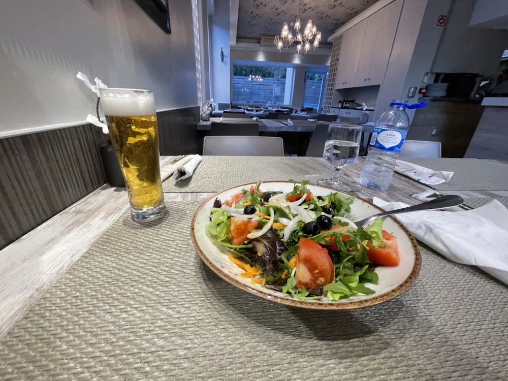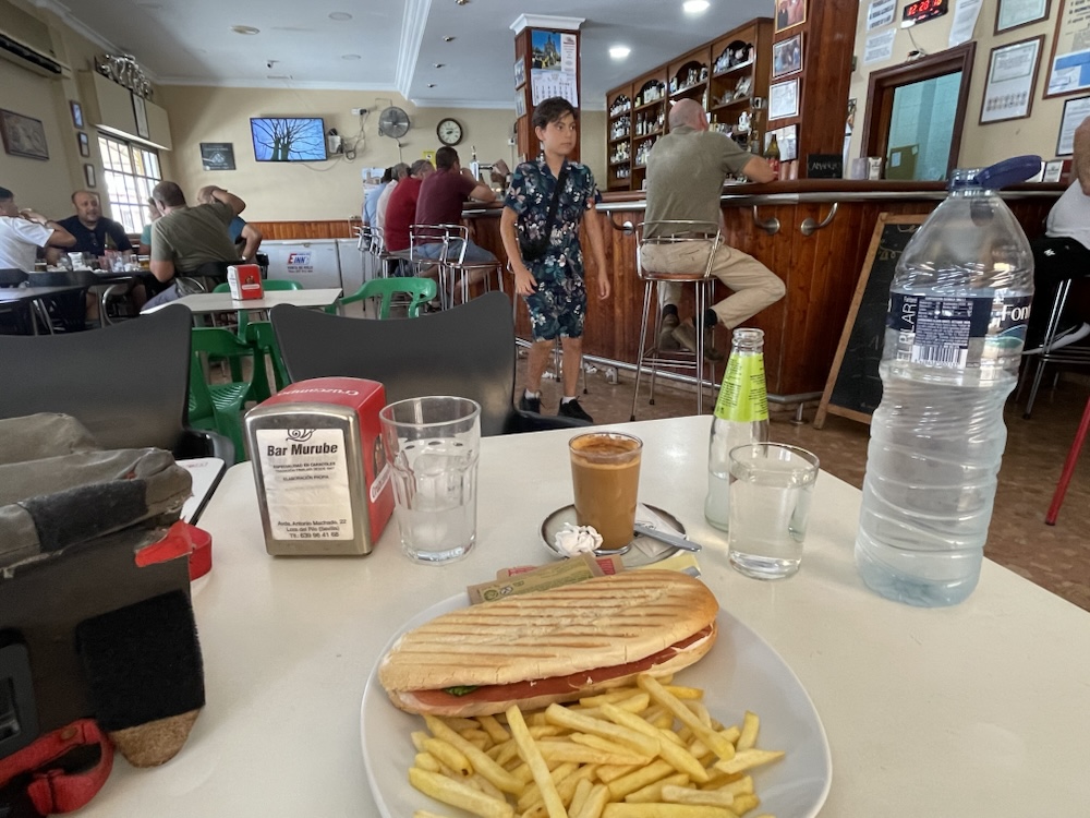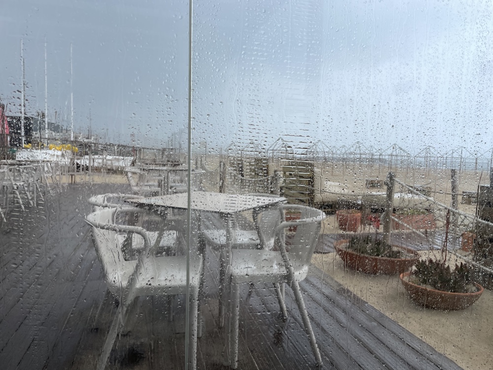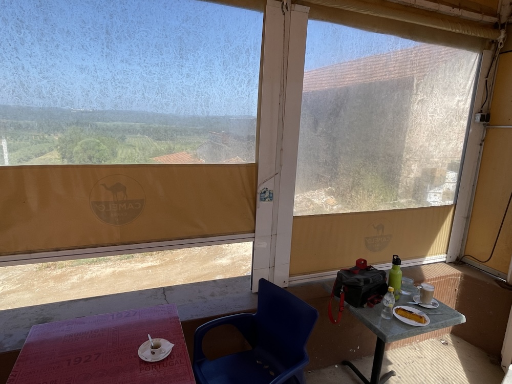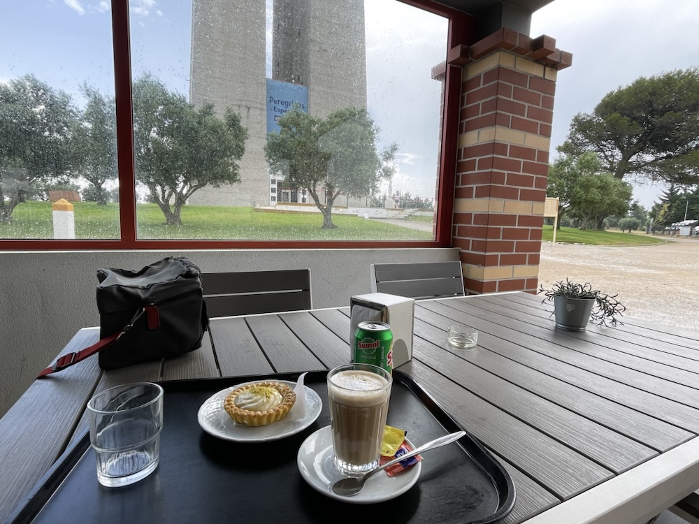 Das Regenwasser läuft an den Scheiben herunter. Das war wohl knapp. Eine Bar auf exakt 20km gefiel mir nicht. Bin weiter. Dann setzte Nieselregen ein, der aber nochmal kurz pausierte, bis ich diese Bar erreicht hatte. Eine zweite Chance von der Wetterfee, die ich glücklicherweise ergriffen habe.