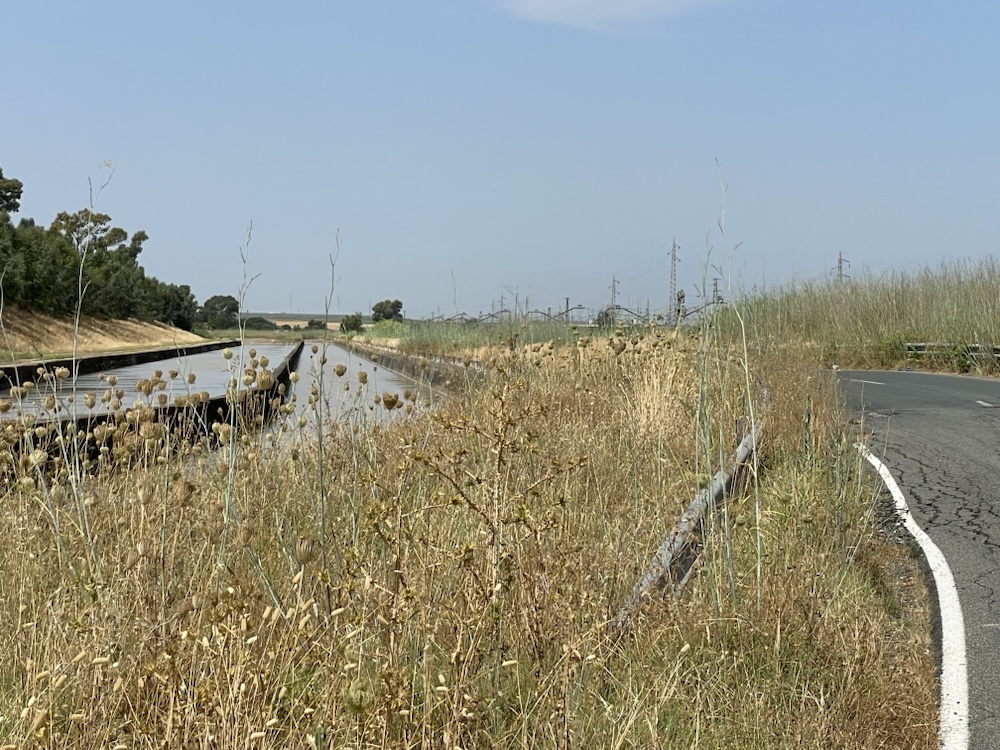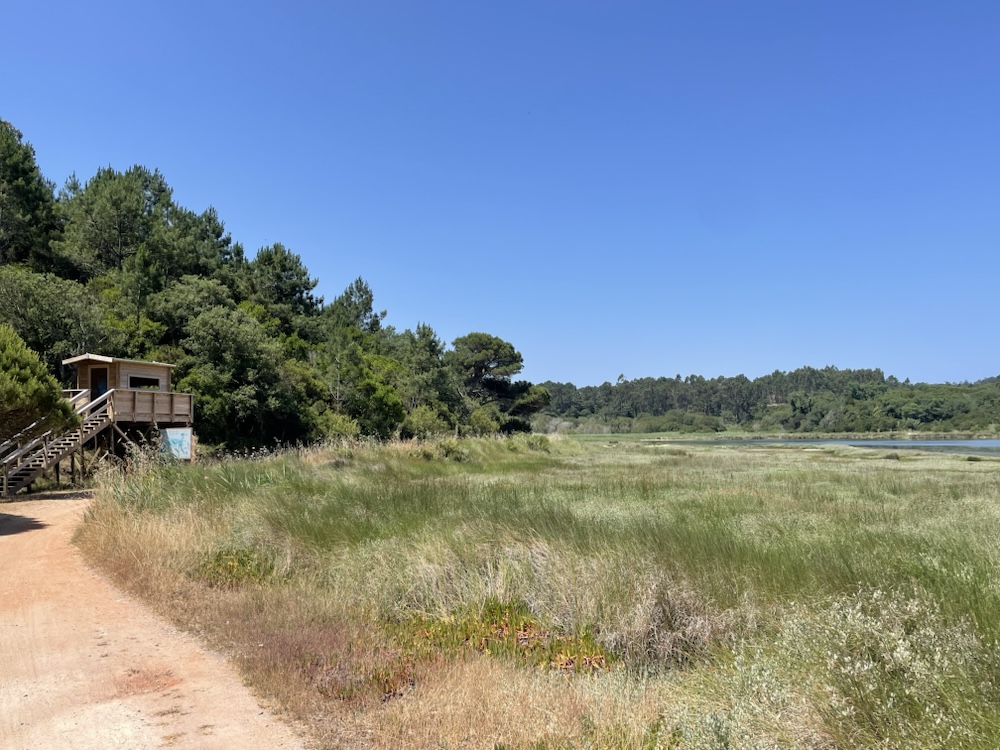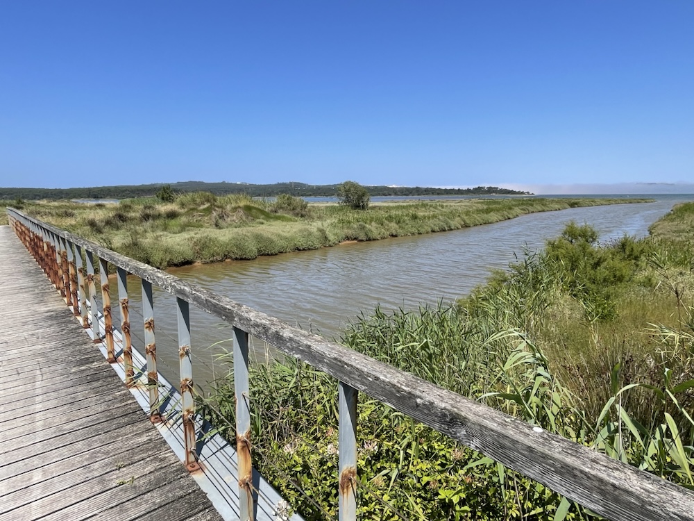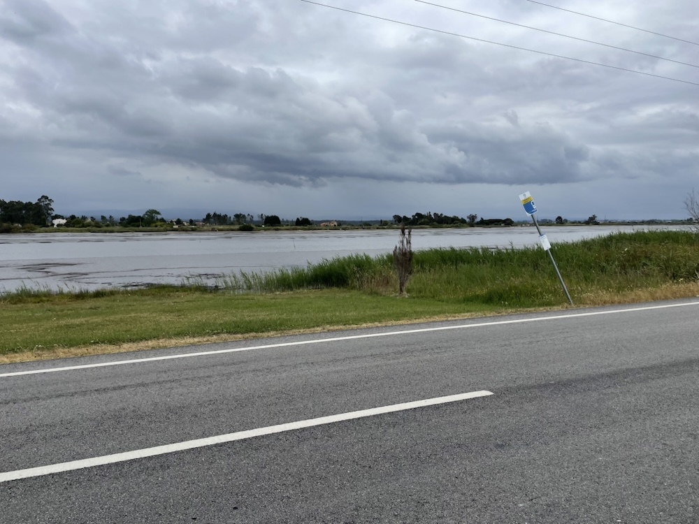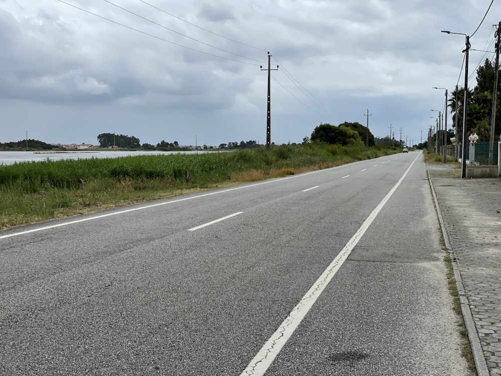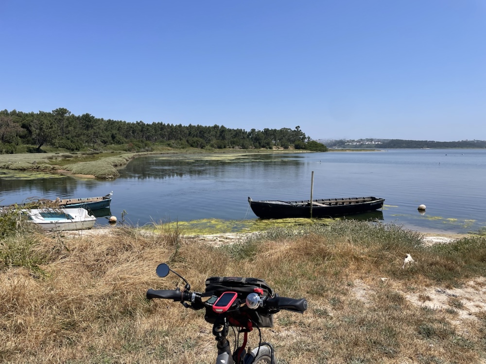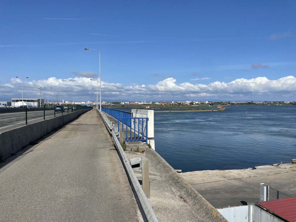13.43 Uhr – Auf Kilometer 47 am westlichen Arm der Ria de Aveiro, der ich bis zur Fähre folge. Ich hätte bald Hunger. Bisher kam kein Supermarkt.