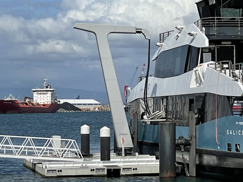 Während der Stopps wird die Batterie der Fähre über das dicke schwarze Kabel geladen.