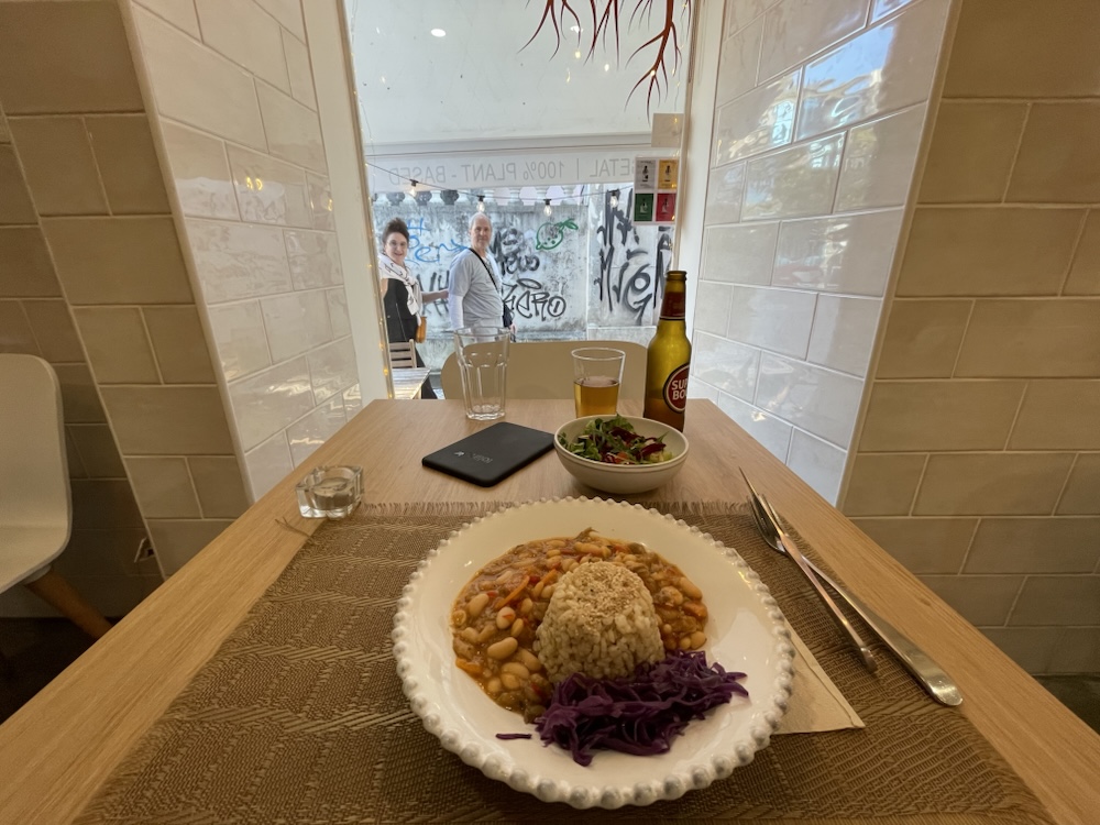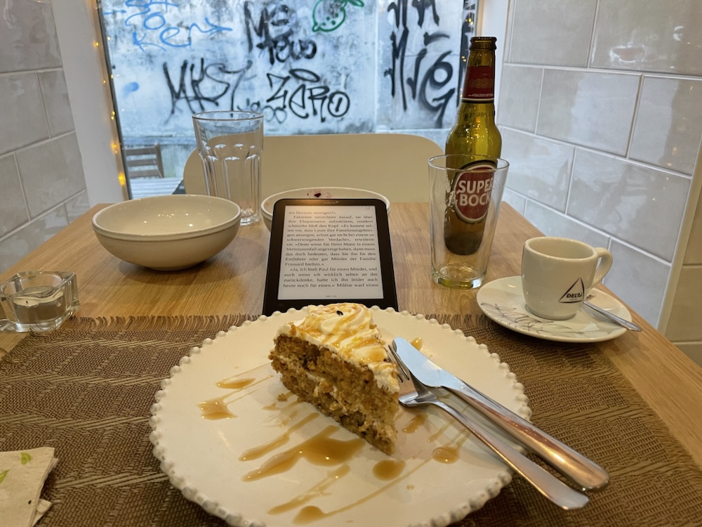 19.58 Uhr – Ich esse super lecker in einem veganen Restaurant. Das ist endlich mal etwas Neues. Ich musste aber noch Süßkartoffelchips zusätzlich nehmen und ein Stück Kuchen. Ich habe einfach mal wieder sehr großen Hunger!