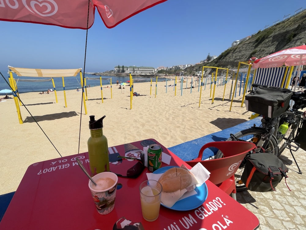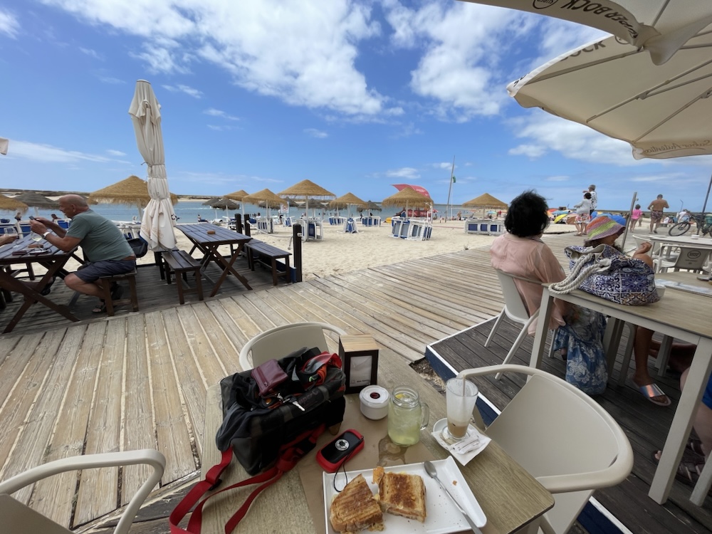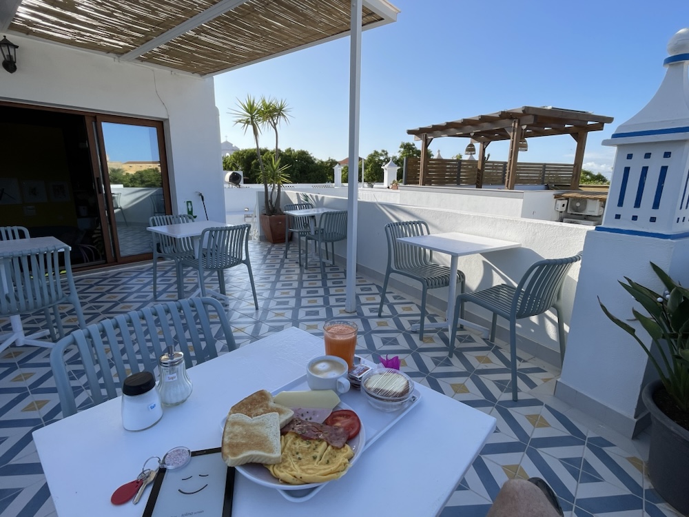 Ich nehme ein zweites Frühstück am Strand. Bin mit vier netten jungen Männern vom Café-Team alleine.