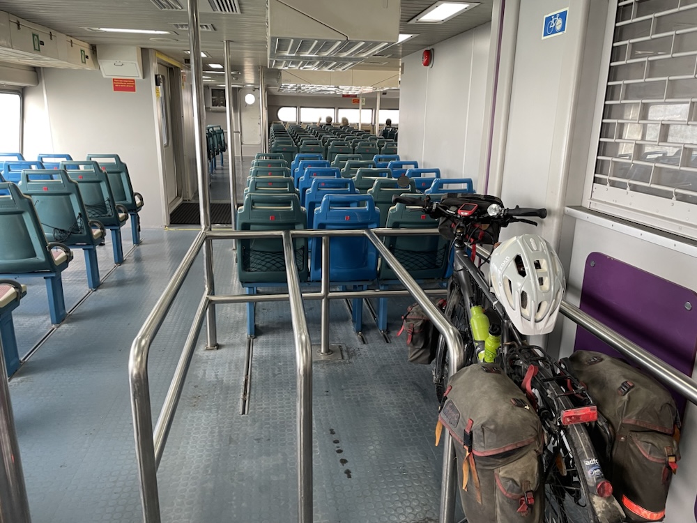21.45 Uhr – Der Lademeister ist Deutscher, sehr ruhiger netter Typ. Ich war sehr gelassen. Als er mit allen Leuten fertig war, hat er mir das Rad auf den Träger geladen und mir dann noch, weil das eine Gepäckfach voll war, mit einem Augenzwinkern ein kleines anderes geöffnet. Ich bin dann gleich zur Toilette zum Händewaschen und Kaffeewegbringen. Er stand vor der Tür, musste ja auch noch Hände waschen.
