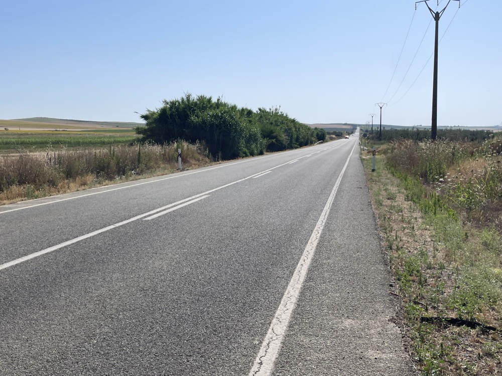 Sehr lange gerade Straße. Endlich Rückenwind. Mit 25 km/h rolle ich hinter den Autos oder einem Roller her.