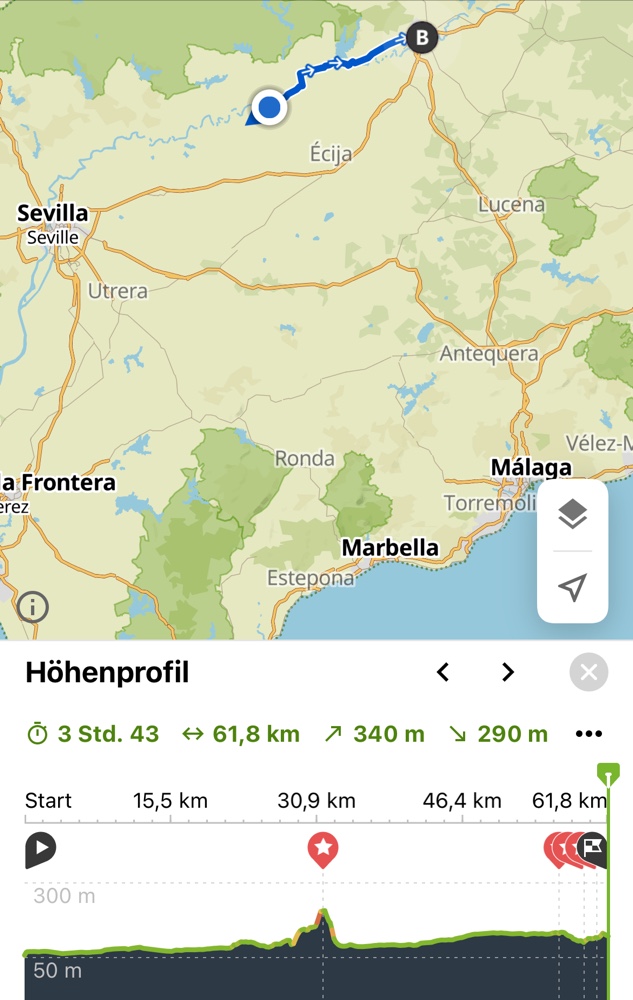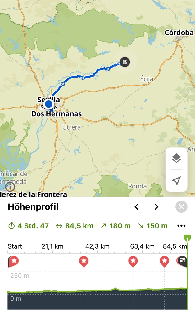 03.07.2025 – Markus: Lieber Leonhard, Willkommen zurück nach dieser langen Tour! Es war ein Vergnügen, dich über deinen Blog begleiten zu dürfen und wie „dabei“ gewesen zu sein. Bestimmt ist die Temperatur heute Morgen ein starker Kontrast zu Sevilla/Córdoba. Ich bin in den letzten Tagen mal bei 37 Grad mit dem Rad ca. 20 km gefahren – mit nassem Buff unter dem Helm und vor-gewässertem Shirt am Körper. Und beim Gedanken an dich und die 50 Grad bekam ich Gänsehaut. Gut, dass du ohne gesundheitliche Probleme unbeschadet durch die Hitze und alles Andere gekommen bist. Dann ein entspanntes Ankommen, Caballero, und bis zum nächsten Tanzen! …nach der Rad-Tour ist vor der Rad-Tour. Liebe Grüße, Markus