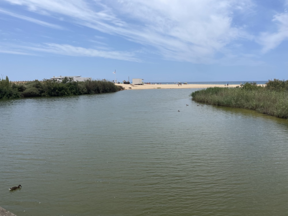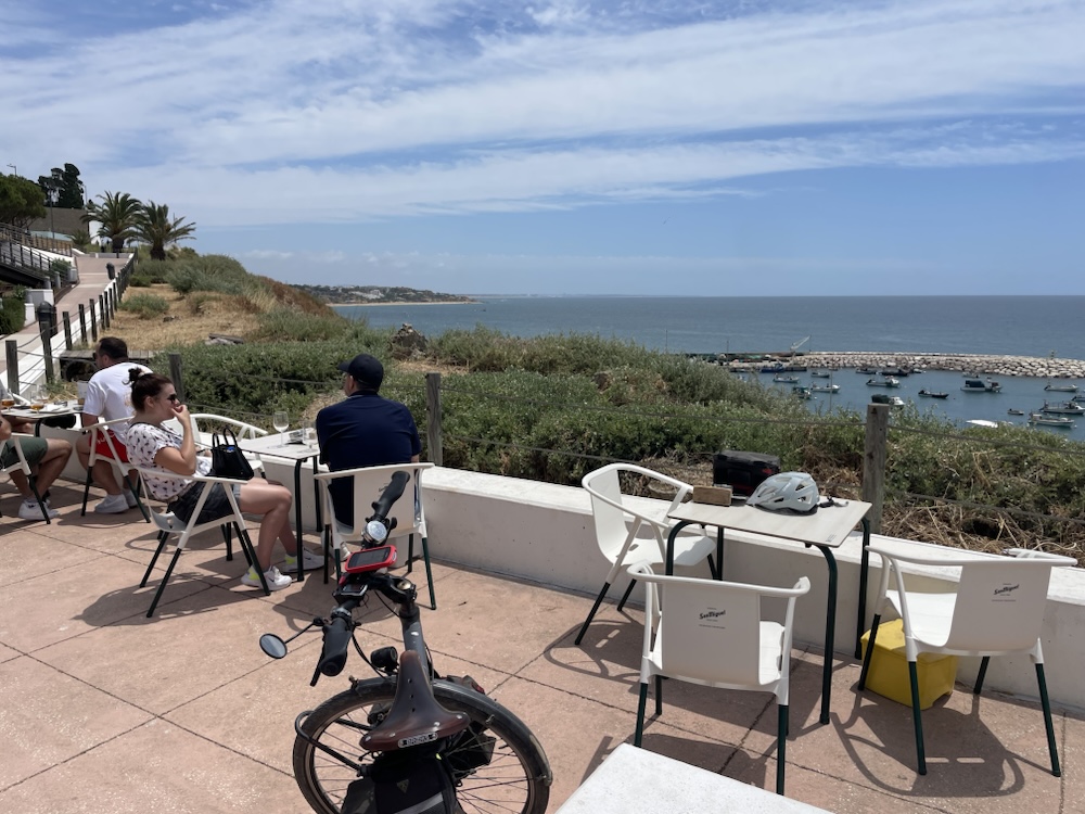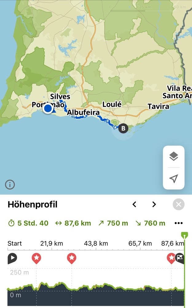 42 km von 88 km habe ich, kann also gut eine Pause brauchen. Vor Faro liegt noch Quarteira. Könnte sein, dass ich am Horizont schon das Naturschutzgebiet westlich von Faro sehen kann.