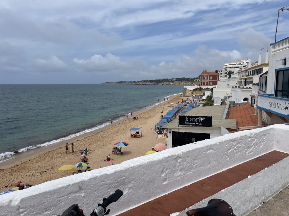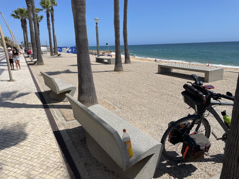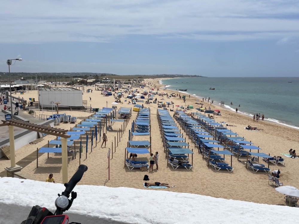 15.05 Uhr – In Quarteira, auf Kilometer 64. hier packe ich mein Müsli aus und lausche den Wellen. Der Wind ist jetzt wieder lebhaft und böig, kommt meist von der Seite oder hinten. Heiß ist es nicht.