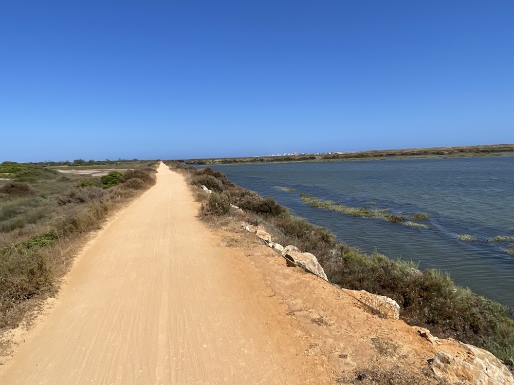 Ich bin im Parque Natural Ria Formosa, im Marschland der Lagune. Ich fahre direkt auf den Flughafen zu. Noch 10 km.