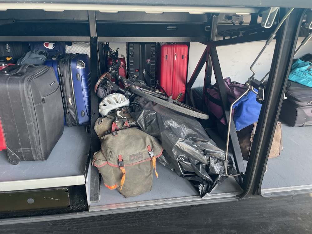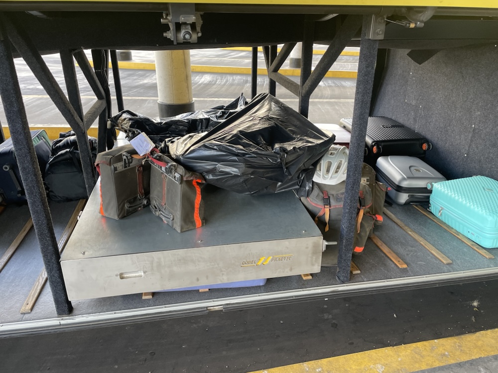 18.20 Uhr – Der Busfahrer kam schon um 18 Uhr auf mich zu und meinte, ich müsse das Vorderrad ausbauen. Darauf war ich ja vorbereitet. Aber das Alurohr zur Stabilisierung der Gabel, wenn kein Rad drin ist, habe ich gestern nicht rausgeräumt. Muss ohne gehen. Der Gepäckträger vorne konnte dranbleiben. Also kein so großer Aufwand. Und die zweite Tüte liegt lose dabei. Die. Eiden Fahrer fanden es gut so.