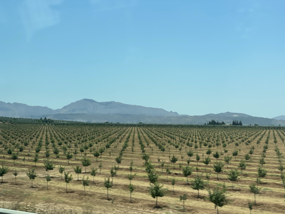 13.44 Uhr – Wir sind auf fast 400 m Höhe. Hier wachsen ausschließlich Olivenbäume. Wir fahren auf die Sierra Nevada zu.
