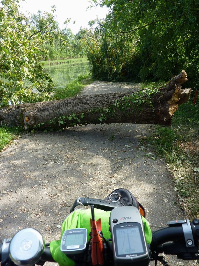 Es lagen wirklich viele Bäume auf der Seite, nach außen, auf dem Radweg oder im Wasser. Einmal musste ich das Rad über einen Baumstamm heben und einige Male sehr knapp am Wasserrand vorbei um einen umgestürzten Baum herum.