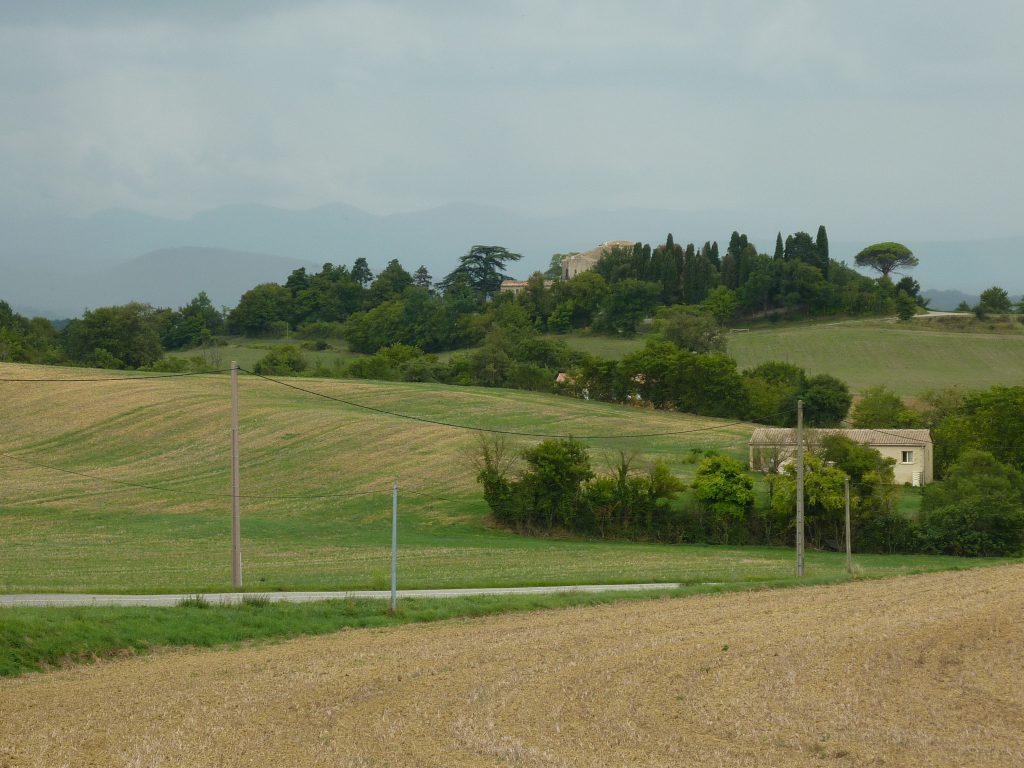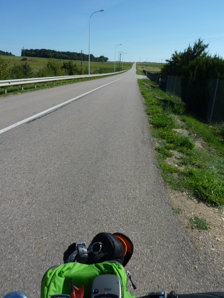Nach ca. 35km ging es vom Kanal auf die Landstraße und ganz lange sanft durch weite Täler hinauf. Aber zu meiner großen Freude war mir Petrus hold und schenkte mir Rückenwind, worüber ich grinsen musste. Es ging durch ein welliges Land mit riesigen Feldern, meist Mais oder Sonnenblumen, die aber fast schwarz waren und nicht schön aussahen. Mit einzelnen großen Höfen auf den Bergspitzen sah es toskanisch aus. Es fehlten nur die Zypressen.