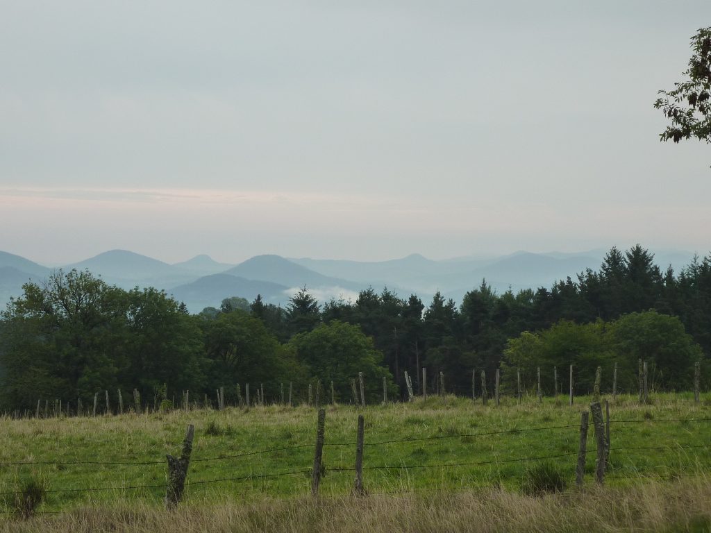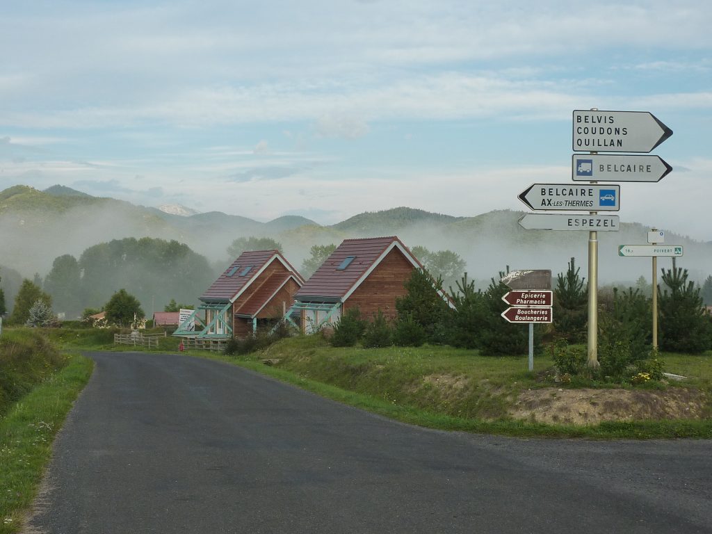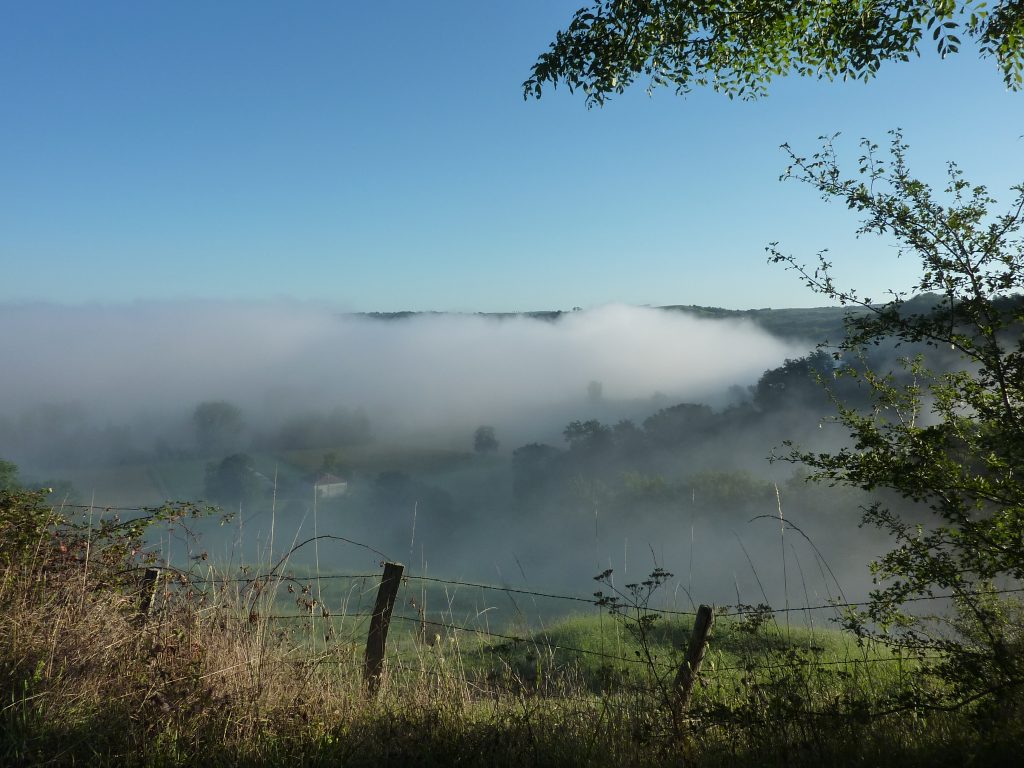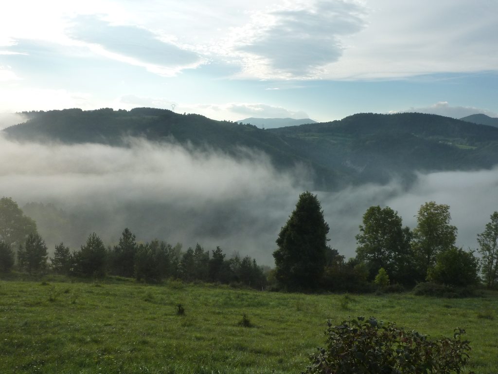 Kurz hinter Espzezel musste ich in einen über 200m tiefen Taleinschnitt in dem der Nebel noch für feuchte Kälte sorgte. Bei 10% Steigung auf der kleinen Straße, die wieder hinauf auf die Ebene führte, wurde mir aber gleich wieder warm.