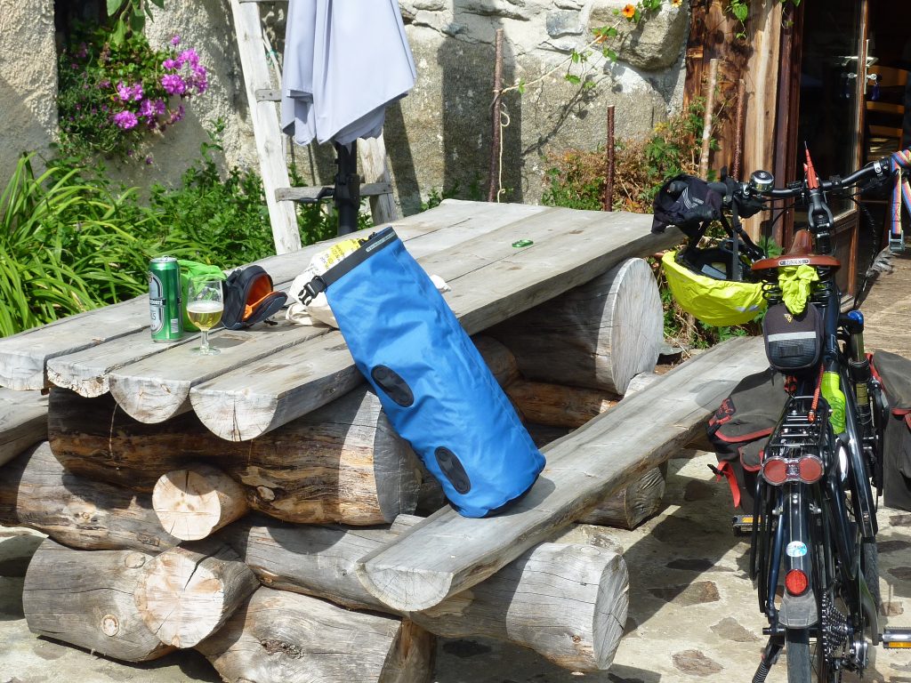 Wertsachen wie Handy und Geldbörse habe ich in einer Gürteltasche verstaut, die am Lenker befestigt war. An dieser Tasche habe ich auch die Suunto-Höhenuhr und den Fotoapparat gehängt. So hatte ich beides immer schnell zur Hand, ohne eine sperrige Lenkradtasche mitnehmen zu müssen. Zwischen den hinteren Taschen lag ein einfacher Rucksack für die Windjacke, Sitzkissen und das Tablet. Als Regenschutz hatte ich einen wasserdichten Kleppersack dabei, in den ich den Rucksack und die Gürteltasche stecken konnte.