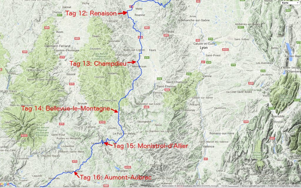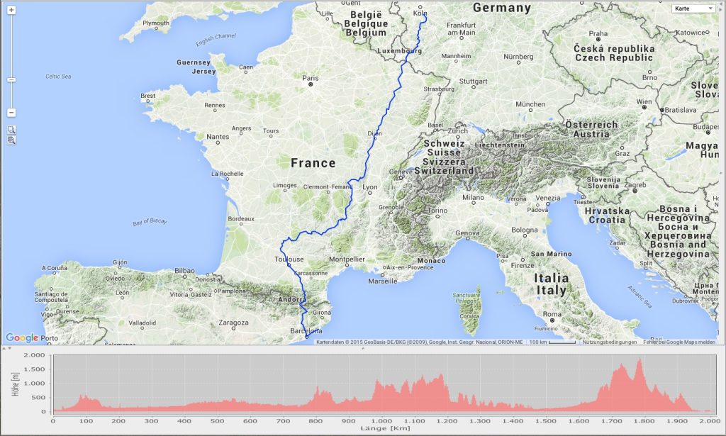 Anhand der Outdoor-Handbücher «Jakobsweg Trier – Le Puy» von Ingrid Retterath und «Frankreich: Jakobsweg Via Podiensis» von Hartmut Engel habe ich die Strecke auf meinem Computer in BaseCamp von Garmin geplant, um sie anschließend in Teil-Tracks à 500 Punkten auf ein Garmin eTrex30 laden zu können. Die geplante Strecke war 1889 km lang. Also würde ich 67 km pro Tag fahren müssen, um in vier Wochen in Barcelona anzukommen. Außerdem wies die Routenplanung ca. 25.000 Höhenmeter aus. Davor hatte ich einen ordentlichen Respekt. Aber ohne Berge würde die Tour langweilig sein.