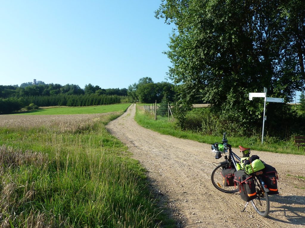 Unter der Fahrrad-Bermuda-Hose habe ich eine kurze Radhose getragen. So konnte ich an heißen Tagen in Radhose und Unterhemd fahren. Auf Klickpedale habe ich angesichts der zu erwartenden Feldwegabschnitte verzichtet und immer meine flachen Wanderschuhe getragen. Regenhose, Überschuhe und Helmcover waren natürlich auch im Gepäck.