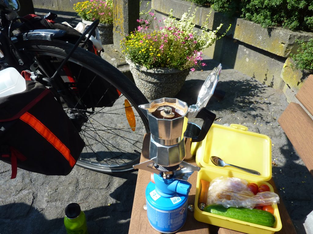 Schließlich habe ich auf Baumstämmen am Wegrand gesessen und den Kaffee gekocht. Es kam ein Rennradfahrer mit Anhänger vorbei gerast, der Anhänger hüpfte wild hinter ihm her.