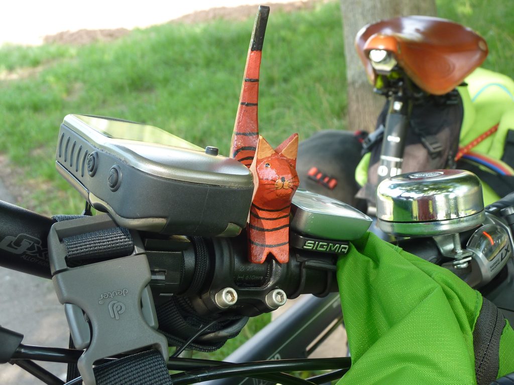In Wittlich habe ich mein kleines Pilgergebet in der Pfarrkirche gehalten. Draußen sprach mich ein Mann an, der aus dem gegenüberliegenden Pfarrhaus kam. Es sähe nach einer weiten Reise aus, meinte er. Wir sprachen einige nette Sätze miteinander und am Ende zog er eine dunkelrote kleine Holzkatze aus der Jackettasche und reichte sie mir mit den Worten «Dann wünsche ich Ihnen, dass die Reise nicht für die Katz ist». Ich habe die Katze mit Kabelbindern am Lenker befestigt. Sie war mit in Barcelona und fährt auch heute noch mit auf meinem Rad.