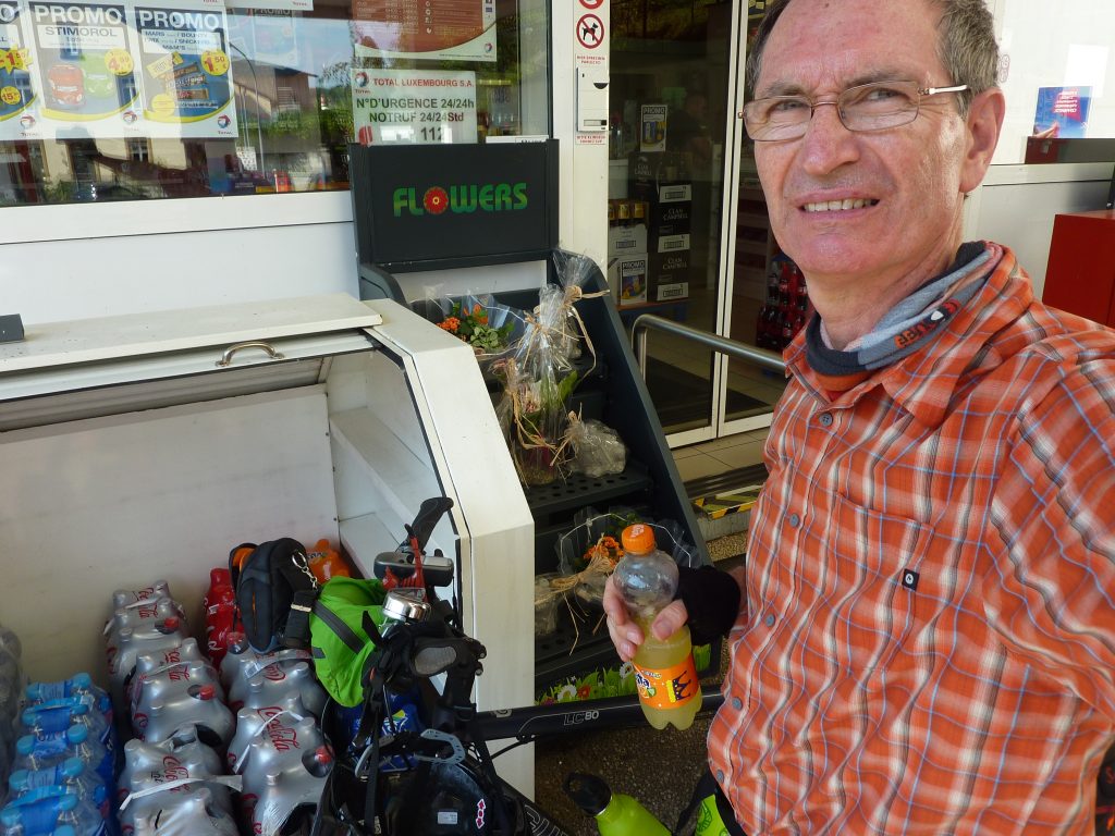 In Schengen bin ich in eine Tankstelle gestürzt und habe mir eine kalte Fanta Lemon und eine 1,5l-Flasche Wasser gekauft. Fanta Lemon war danach das Erfrischungs-Belohnungs-Getränk auf allen Etappen. Und eine 1,5l-Flasche Wasser hatte ich danach wann immer möglich zusätzlich in einer hinteren Packtasche.