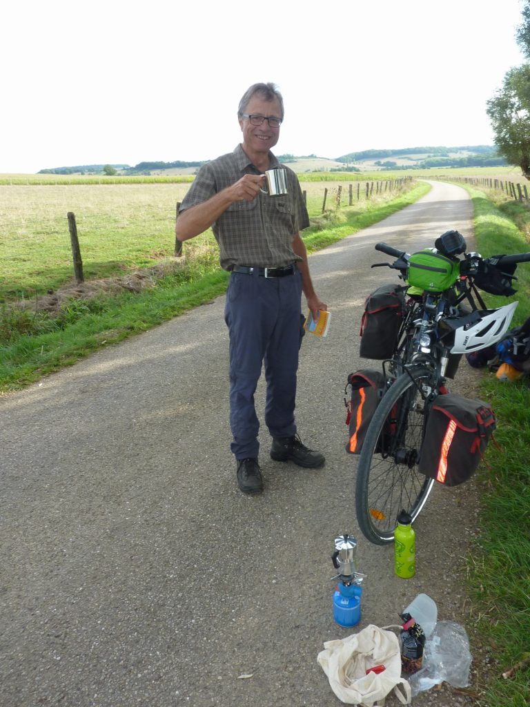Am nächsten Morgen traf ich ihn nach 8 km auf meiner Strecke. Er hatte noch nicht einmal einen Kaffee auf dem Campingplatz bekommen. Also habe ich ihm am Wegrand einen gekocht. Auch das war sehr nett, er hat sich echt gefreut.
